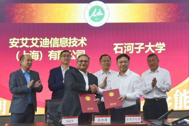 NIIT全球副總裁、中國區(qū)總裁柯謀·杜博(Kamal Dhuper)與石河子大學(xué)黨委副書記、校長代斌分別代表雙方簽署《石河子大學(xué)-安艾艾迪共建計(jì)算機(jī)相關(guān)專業(yè)合作協(xié)議》。