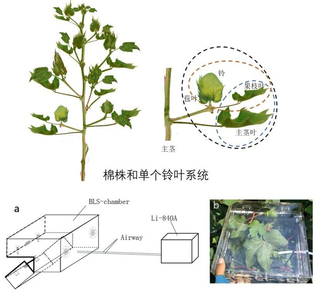 圖1 棉花鈴葉系統光合作用及測定系統示意圖(a)和實物圖(b)