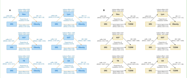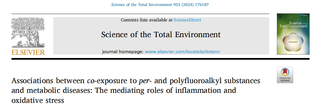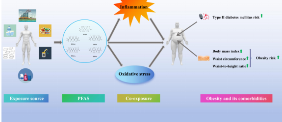 全氟和多氟烷基物質(zhì)(PFAS)是一類具有高度氟化特性的合成化合物,其分子結(jié)構(gòu)中含有至少一個(gè)全氟或多氟烷基鏈,因其優(yōu)異的疏水性和抗油性而廣泛應(yīng)用于工業(yè)和消費(fèi)品中。然而,由于其持久性、生物積累性及潛在的生態(tài)和健康風(fēng)險(xiǎn),PFAS已成為全球環(huán)境科學(xué)和公共衛(wèi)生領(lǐng)域的重要研究對(duì)象。該研究深入評(píng)估了PFAS聯(lián)合暴露對(duì)肥胖和2型糖尿病(T2DM)的影響,并探討了炎癥和氧化應(yīng)激在這一過(guò)程中的中介作用。研究結(jié)果顯示,環(huán)境風(fēng)險(xiǎn)評(píng)分(ERS)每增加一個(gè)單位,肥胖和T2DM的幾率分別顯著增加3.60倍和1.91倍。同時(shí),ERS的增加還與BMI、腰圍以及腰高比的顯上升密切相關(guān)。進(jìn)一步的分析發(fā)現(xiàn)炎癥和氧化應(yīng)激在ERS與肥胖和T2DM關(guān)聯(lián)中起到了顯著的中介作用。這一發(fā)現(xiàn)揭示了PFAS聯(lián)合暴露與肥胖和T2DM之間的潛在關(guān)聯(lián),并提示這些關(guān)聯(lián)可能由炎癥和氧化應(yīng)激所介導(dǎo),為深入理解PFAS的健康影響提供了新的視角。