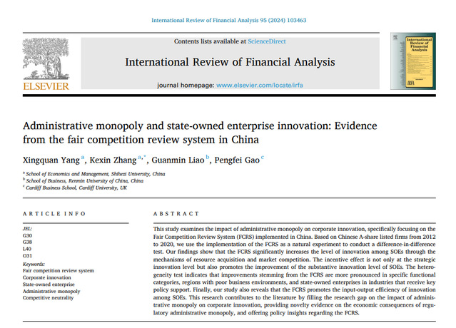 近日,石河子大學經濟與管理學院楊興全教授以第一作者身份與張可欣博士撰寫的學術論文“Administrative monopoly and state-owned enterprise innovation: Evidence from the fair competition review system in China”在金融學國際權威期刊《International Review of Financial Analysis》(JCR Q1,中國科學院一區,ABS 3)2024年第95卷正式刊出。