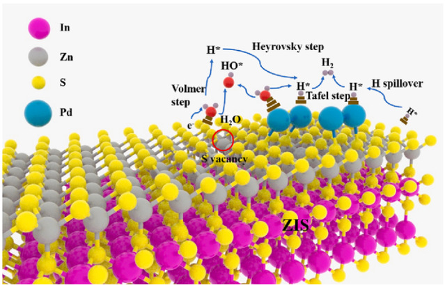 氫能被認(rèn)為是替代化石能源的清潔能源。析氫反應(yīng)(HER)是一種可持續(xù)的氫能源生產(chǎn)方式。然而,用于析氫反應(yīng)的商用鉑(Pt)催化劑價(jià)格昂貴且稀缺,無法完全滿足未來市場的需求。鈀(Pd) 豐度高于Pt,具有很強(qiáng)的化學(xué)穩(wěn)定性。鈀納米團(tuán)簇對H2的固有親和力和選擇性、快速吸附動(dòng)力學(xué)和氫化物形成可逆性,具有很高的HER催化活性,可以作為理想的HER活性中心。ZnIn2S4 (ZIS)是一種典型的三元硫系化合物,具有良好的H吸附特性和良好的腐蝕性能,是一種很有前景的HER的催化劑。本研究將7.5 wt%的Pd納米團(tuán)簇(2-5 nm)高分散穩(wěn)定在ZIS納米片上,發(fā)現(xiàn)在低溫退火過程中,Pd團(tuán)簇的存在可以使得ZIS的形貌和結(jié)構(gòu)保持的同時(shí)產(chǎn)生更多的S空位,并且有助于提高ZIS上S原子的催化能力,激活ZIS基表面的活性。