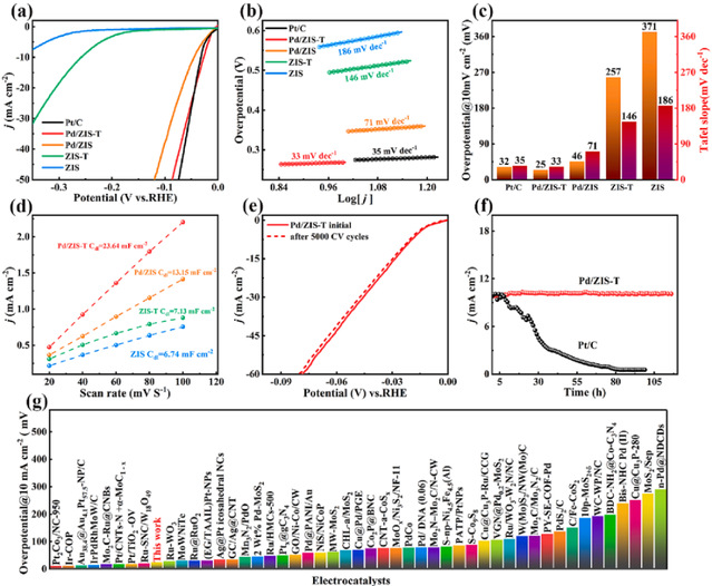 該工藝制備的Pd/ZIS展現(xiàn)出優(yōu)異的電催化HER性能:當(dāng)電流密度為10 mA cm-2時(shí),Pd/ZIS-T樣品的傳遞電位可達(dá)25 mV(相對于RHE),Pt/C低于32 mV, Tafel斜率僅為33 mV / dec-1,反應(yīng)速率更快,在10 mA cm-2下可穩(wěn)定輸出100 h以上。本研究的相關(guān)結(jié)果對探索新型電解水制氫催化劑具有一定的參考意義。