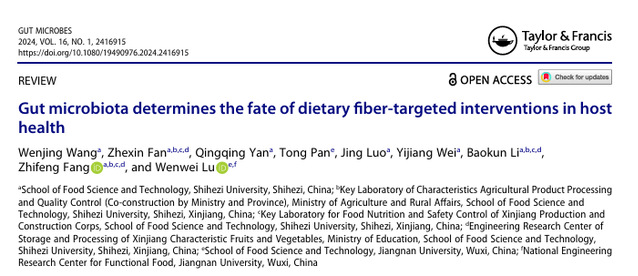 近日,我校食品學院方志鋒副教授指導研究生在gut microbes(中國科學院一區Top, IF=12.2)發表了題為“Gut microbiota determines the fate of dietary fiber-targeted interventions in host health”(腸道菌群決定膳食纖維干預宿主健康的命運)的原創性綜述論文。