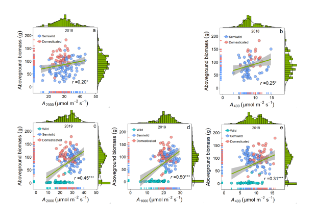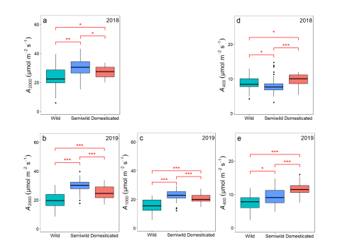圖2 比較2018年(a、d)和2019年(b、c、e)野生、半野生和栽培材料光合速率差異