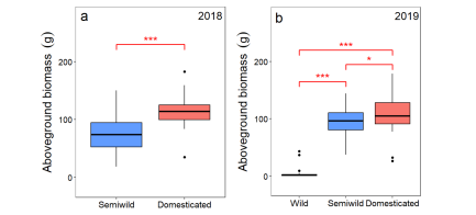 圖1 比較2018年(a)和2019(b)年野生、半野生和栽培材料地上部生物量差異