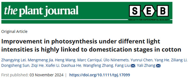 2024年11月3日,石河子大學農(nóng)學院張旺鋒教授團隊聯(lián)合西北農(nóng)林科技大學農(nóng)學院賀道華團隊及中國農(nóng)業(yè)科學院棉花研究所劉方團隊在The Plant Journal期刊(中國科學院1區(qū)TOP期刊,五年影響因子7.1)在線發(fā)表了題為”Improvement of photosynthesis under different light intensities is highly linked to domestication stages in cotton”的研究論文(http://doi.org/10.1111/tpj.17099)。作者發(fā)現(xiàn)在馴化第一階段(從野生到半野生)提高了高光和中光下的光合速率,第二馴化階段(從半野生到栽培材料)改善了低光下的光合速率,從而有助于兩個馴化階段生物量的增加。因此,隨著馴化不斷向前推進,棉花葉片不同光強光合速率逐步提高。論文的通訊作者張亞黎教授圍繞棉花馴化的光合作用研究,團隊已發(fā)表系列高水平論文,應(yīng)邀在國內(nèi)和國際學術(shù)會議上作報告多次,研究成果得到業(yè)內(nèi)專家的認可。