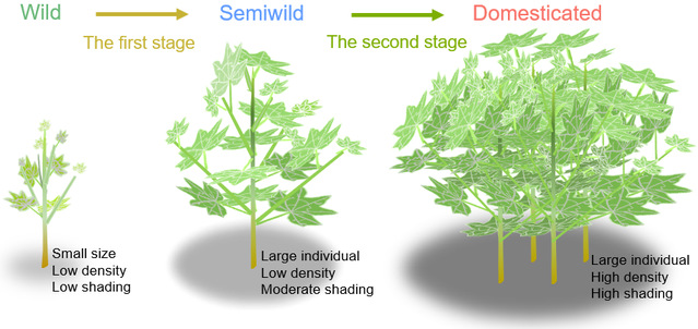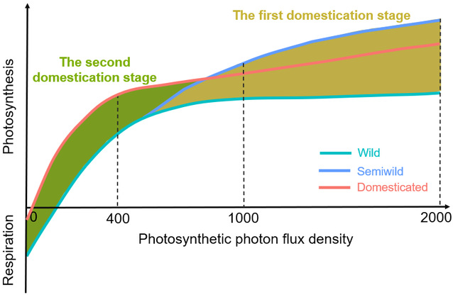 馴化第一階段主要關(guān)注單株生產(chǎn)力,植物生長在相對稀疏的環(huán)境中或沒有農(nóng)田單一栽培環(huán)境(圖5),植物通常處在高光環(huán)境中,因此馴化往往選擇強光下光合速率高的特征,從而增加生物量。馴化第二階段冠層結(jié)構(gòu)改變和種植密度增加導致作物更多處在低光環(huán)境中,葉片產(chǎn)生弱光適應(yīng)性變化,包括增加葉面積、降低比葉重和提高低光光合速率等從而獲得更多地上部生物量(圖1;圖2)。結(jié)合前人研究可以看出,在過去的作物馴化和育種過程中,不同光照強度下的光合速率往往分階段或單獨優(yōu)化,而不是同步優(yōu)化,這似乎暗示選擇提高高光或低光下的光合速率之間存在潛在權(quán)衡機制。這些發(fā)現(xiàn)不僅為馴化過程中光合特性的變化提供了新的見解,還進一步證明了提高整體光合能量轉(zhuǎn)換效率以增加當代作物生物量和產(chǎn)量的可行性。