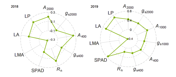 圖3 圖示2018和2019年地上部生物量與生理和結(jié)構(gòu)特征的相關(guān)系數(shù)
