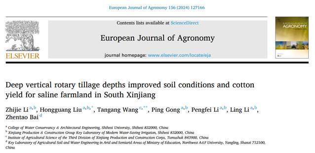 近日,石河子大學水利建筑工程學院劉洪光教授團隊在深垂直旋耕改良鹽堿地機理研究方面取得了重要研究進展。相關研究成果以“Deep vertical rotary tillage depths improved soil conditions and cotton yield for saline farmland in South Xinjiang”為題,發表國際農林科學-農藝學期刊European Journal of Agronomy上(中國科學院一區TOP期刊)。