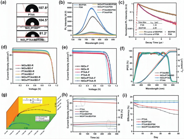 近年來,倒置鈣鈦礦太陽能電池(IPSCs)取得了令人印象深刻的發展。然而,該類器件的效率仍遠落后于理論極限,阻礙了其商業化進程。為了解決上述問題,石河子大學黎陽等人利用4-丁二醇溴化銨(BD)與鈣鈦礦形成鉛氮配位鍵來鈍化鉛離子缺陷,同時,鈣鈦礦埋底界面上的甲脒離子空位也被BD分子中的胺基團所填充,進而得到了結晶質量更好的鈣鈦礦薄膜。由于PTAA和BD分子之間形成氫鍵使得器件內界面之間的接觸更為優良,導致經BD改性的鈣鈦礦薄膜平均晶粒尺寸顯著增加,瞬態熒光壽命提高至2.49 μs。與對照器件相比,通過BD層修飾后的器件不僅效率提升,更表現出顯著增強的熱與光穩定性,為制備高性能IPSCs提供了借鑒。