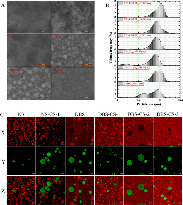 圖1 不同淀粉制備的酸洗乳液體系分析。A:光學顯微照片,B:液滴大小分布,C:Pickering乳液CLSM圖像