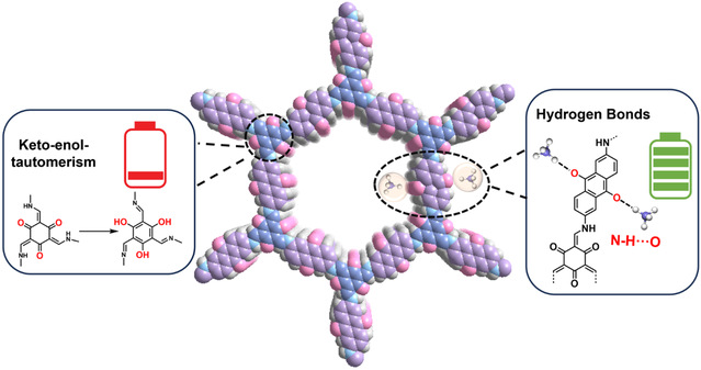 近年來,水系非金屬離子電池因安全性高、成本低、充電快等優勢備受關注,其中NH4+離子憑借資源豐富、水合離子半徑小(擴散速度快)、靈活的四面體結構(便于形成氫鍵)脫穎而出。然而,盡管無機電極材料在水系銨離子電池(AAIBs)中發展已久,但仍面臨諸多挑戰。有機分子作為電極材料雖具有結構可設計、活性官能團豐富、可持續性強等優點,但有機小分子易溶解,影響電池循環穩定性。相比之下,共價有機框架(COFs)憑借其豐富的孔道、官能團和牢固的共價鍵,為NH4+離子的嵌入/脫出提供了有利環境。然而,目前關于COFs作為AAIBs電極材料的研究較少,其儲能機理,尤其是羰基官能團與NH4+離子的相互作用機制尚不明確,相關應用研究存在空白,亟待深入探索。