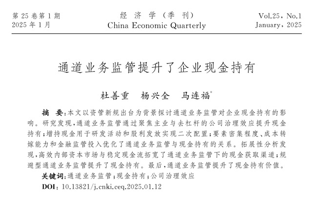 近日,我校經(jīng)濟與管理學院楊興全教授以通訊作者身份與合作者撰寫的學術論文“通道業(yè)務監(jiān)管提升了企業(yè)現(xiàn)金持有”在經(jīng)濟學權威期刊《經(jīng)濟學(季刊)》第25卷第1期正式刊出。