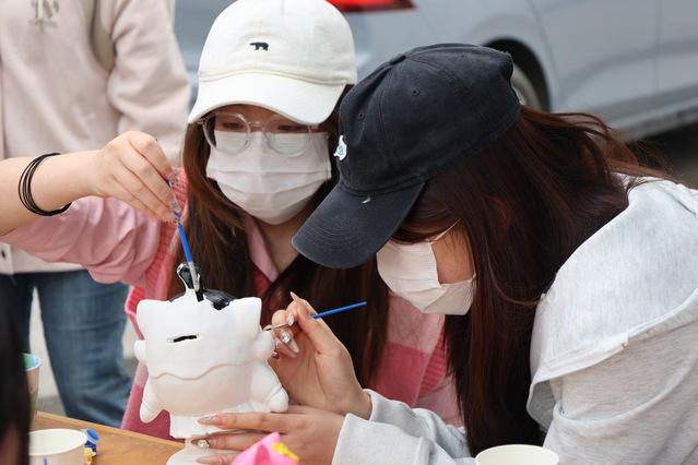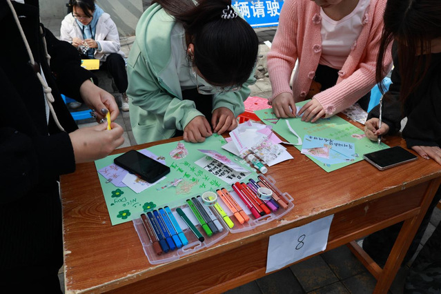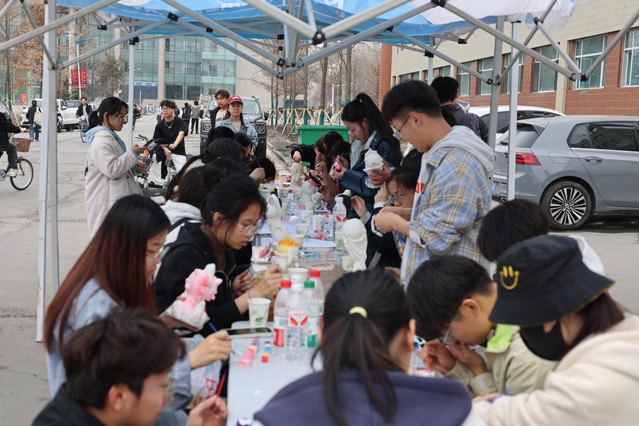 馬克思主義學院與外國語學院間的空地變身創意工坊。3月22日至23日,同學們用黏土捏出萌芽的種子,以毛線編織絢爛花環,在帆布包上拓印春日的抽象畫。顏料與指尖共舞,空氣里漂浮著手作星人的荷爾蒙。