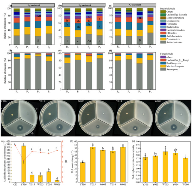 本研究基于4年的定位試驗,研究了長期施用氮肥和磷肥對紫花苜蓿根際土壤理化性質及微生物群落結構的影響。同時我們在紫花苜蓿田根際土壤篩選出5株根際促生菌并進行盆栽促生效應驗證。研究表明氮肥和磷肥顯著改變了土壤理化性質和細菌群落結構,但對土壤微生物多樣性沒有顯著影響。土壤細菌比真菌對氮肥和磷肥更敏感。應用根際促生菌可以顯著增加苜蓿的地上生物量。研究結果有助于理解氮磷肥處理下土壤微生物群落的變化規律,為旱地農業生態系統的可持續發展提供理論支持。