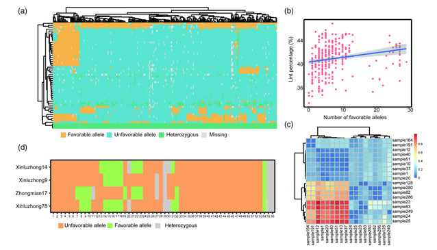 通過馴化選擇分析表明,栽培種衣分相關位點的遺傳多樣性顯著低于半野生棉,表明還存在未充分挖掘的育種潛力。此外,構建56個有利等位基因庫,篩選出20份高聚合材料,為親本選配提供資源(圖2)。