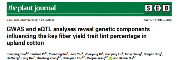 近日,石河子大學聯合華中農業大學棉花遺傳改良團隊在The Plant Journal(中國科學院1區TOP期刊,五年影響因子7.1)在線發表了題為“GWAS and eQTL analyses reveal genetic components influencing the key fiber yield trait lint percentage in upland cotton”的研究論文。該研究通過轉錄組測序了312份陸地棉種質(含新疆主栽品種及育種中間材料),結合田間表型和基因組重測序數據,鑒定了調控棉花衣分性狀的調控位點和候選基因。進一步通過整合優異遺傳位點,系統評估了不同陸地棉品種對衣分性狀的改良潛力,據此篩選出了精準培育高衣分棉花新品種的有價值育種材料。