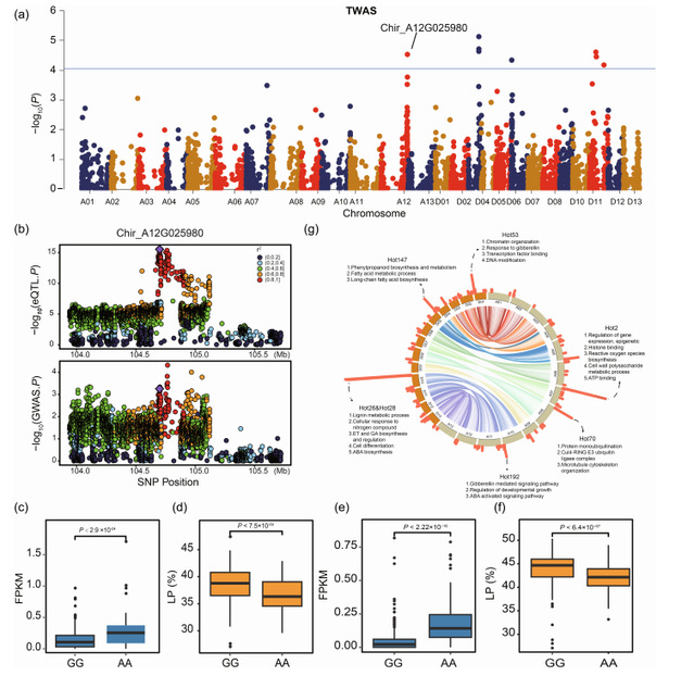 本研究采用GWAS、eQTL定位、TWAS及共定位分析,系統解析衣分的遺傳調控網絡。eQTL分析鑒定出13859個調控位點,發現D10染色體上的Hot26和Hot28熱點協同調控186個基因,涉及細胞壁合成、活性氧代謝及激素響應通路。通過TWAS分析,鑒定Ghir_A12G025980(HSP22)為核心候選基因,HSP22作為葉綠體熱激蛋白,其高表達顯著降低衣分(圖1)