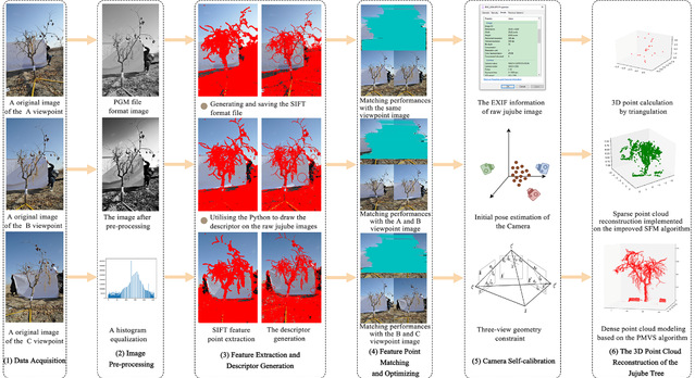 休眠期棗樹修剪是合理控制棗樹樹形,維持棗樹養(yǎng)分,控制病蟲害,增加次年產(chǎn)量,保證紅棗質(zhì)量的重要生產(chǎn)過程之一。當(dāng)前,棗樹修剪方式主要以人工為主,存在費(fèi)時(shí)費(fèi)力、成本高、效率低等問題,迫切需要通過機(jī)械化、智能化棗園管理模式實(shí)現(xiàn)紅棗產(chǎn)業(yè)的節(jié)本、提質(zhì)和增效。利用先進(jìn)技術(shù)手段實(shí)時(shí)快速地重建單株棗樹的三維模型,估計(jì)其三維空間結(jié)構(gòu)信息,準(zhǔn)確地識(shí)別棗樹樹枝的分布情況,實(shí)現(xiàn)棗枝無損測量是智能化修剪的關(guān)鍵技術(shù)之一。因此,團(tuán)隊(duì)提出了一種基于多視角圖像序列的棗樹三維重建及無損測量方法,并驗(yàn)證了方法的有效性。結(jié)果表明,該方法識(shí)別主枝數(shù)量的準(zhǔn)確率為92%,評(píng)估株高和樹冠直徑的準(zhǔn)確率為95%。研究結(jié)果為實(shí)現(xiàn)棗樹智能化修剪提供可視化研究基礎(chǔ)和技術(shù)支撐。