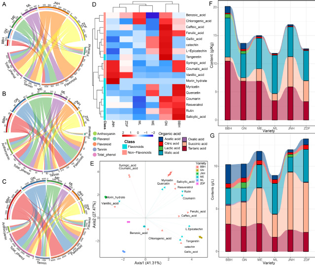 圖2 不同品種釀酒葡萄和葡萄酒中多酚、有機酸的分布特征(Food Chemistry:X, 2024, 21:101091)