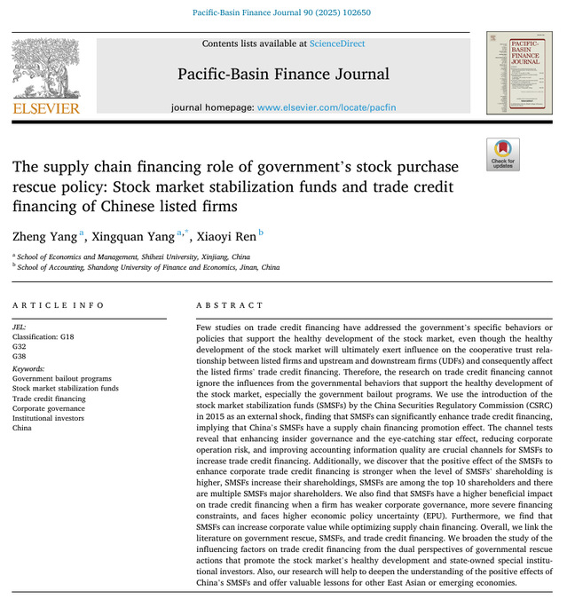 近日,石河子大學(xué)經(jīng)濟(jì)與管理學(xué)院楊興全教授以通訊作者身份與合作者撰寫的學(xué)術(shù)論文“The supply chain financing role of government's stock purchase rescue policy: Stock market stabilization funds and trade credit financing of Chinese listed firms”在金融學(xué)領(lǐng)域國際著名期刊《Pacific-Basin Finance Journal》(JCR Q1)2025年第90卷正式刊出。