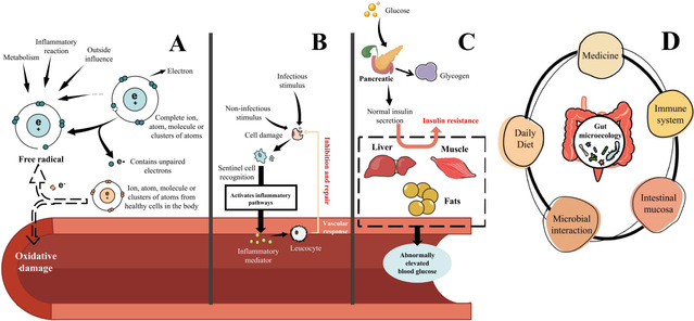 圖2 人體內自由基的形成(A)、炎癥形成過程(B)、2 型糖尿病的發(fā)病機理(C)以及影響腸道微生態(tài)的主要因素(D)