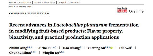 近日,石河子大學食品學院單春會教授團隊杜瑩琳付熙哲等人在國際食品Top期刊《Comprehensive reviews in food science and food safety》(中科院一區(qū)Top期刊,IF5=16)發(fā)表題為“植物乳桿菌發(fā)酵水果產品的最新進展:風味特性、生物活性及實際生產應用”(Recent advances in Lactobacillus plantarum fermentation in modifying fruit-based products: flavor property, bioactivity, and practical production applications)的綜述性論文。