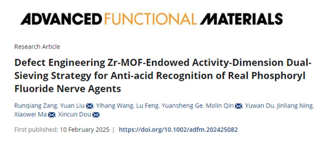 我校化學化工學院材化專業2022級碩士研究生臧潤薔為第一作者,石河子大學為第一單位,中國科學院新疆理化所竇新存研究員、劉媛研究員、石河子大學馬曉偉副教授和國民核生化災害防護國家重點實驗室秦墨林博士為共同通訊作者。