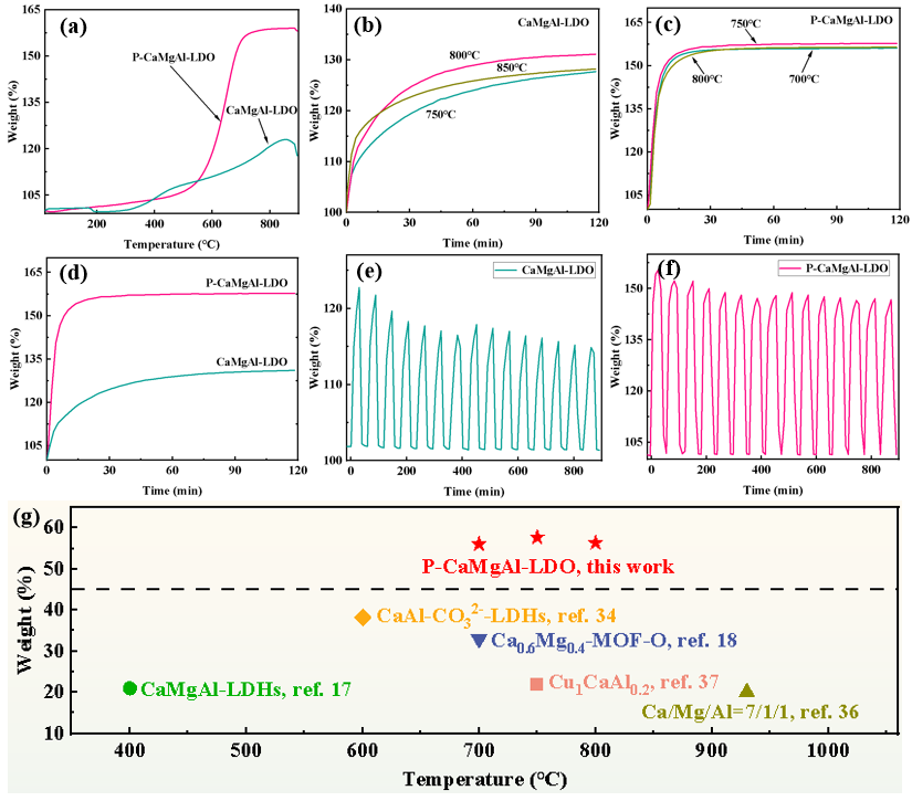 圖3 CaMgAl-LDO和P-CaMgAl-LDO的(a)CO2動態吸附/解吸曲線、(b, c)不同溫度下的恒溫吸附2 h的性能比較、(d)最佳吸附溫度下的恒溫吸附2 h的性能比較、(e, f)最佳吸附溫度下的15個循環穩定性、(g)不同類型水滑石吸附劑對CO2的吸附性能