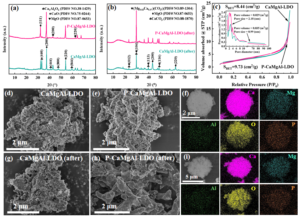 圖2 (a,b)CaMgAl-LDO和P-CaMgAl-LDO吸附前后的XRD圖;(c)CaMgAl-LDO和P-CaMgAl-LDO的N2吸附/解吸等溫線和孔容孔徑分布圖;(d, e, g, h)CaMgAl-LDO和P-CaMgAl-LDO吸附前后的SEM圖;(f, i)P-CaMgAl-LDO吸附前后的mapping圖
