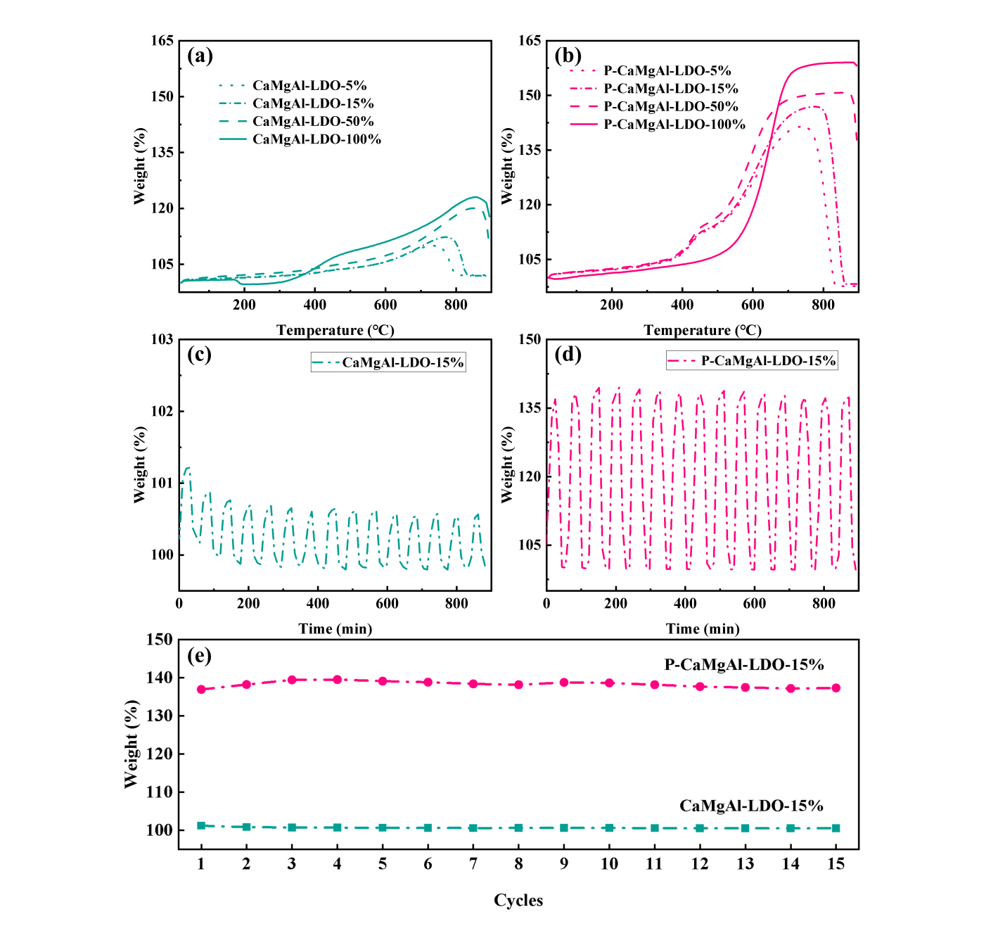 圖4 CaMgAl-LDO和P-CaMgAl-LDO的(a, b)不同二氧化碳分壓下的動態吸附/解吸曲線、(c, d)在15 vol.% CO2分壓下15個吸附/解吸循環中的穩定性和(e)循環穩定性比較