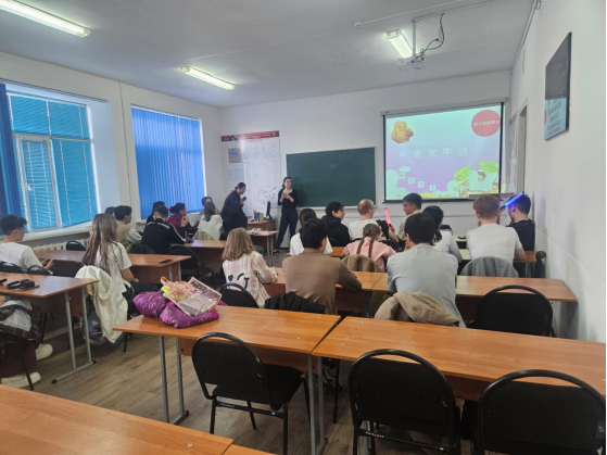 與此同時,我校卡拉干達薩金諾夫技術大學孔子學院以“漢字尋根,絲路傳音”為主題開展了特色活動。活動精心設計了甲骨文探秘和中文歌曲大賽兩個環節。在甲骨文猜字游戲中,學員們通過辨識象形文字猜測現代漢字,現場氣氛緊張而熱烈;中文歌曲比賽環節,參賽選手們用標準的發音和飽滿的情感演繹了《晴天》《月亮代表我的心》等經典曲目,展現了出色的中文水平。孔子學院學員艾琳娜激動地表示:“甲骨文猜字像一場有趣的考古冒險,那些古老的符號讓我對漢字產生了更深的熱愛。”