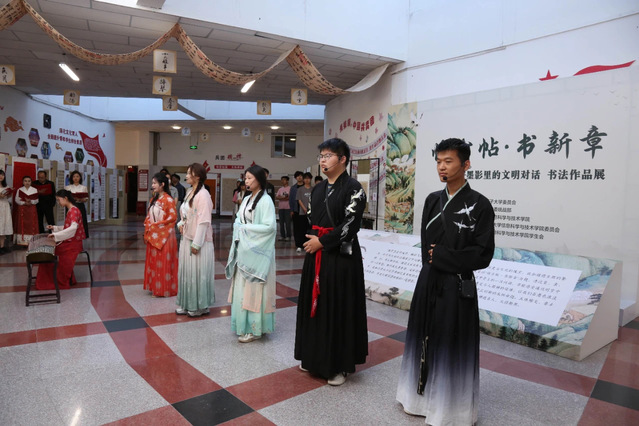 開幕式后,與會人員前往“臨古帖·書新章”藝術(shù)展參觀。展區(qū)以文字演變歷程為布展脈絡(luò),系統(tǒng)展示篆書、隸書、楷書、行書、草書等字體的演變軌跡及其蘊含的中國智慧。每件作品旁均設(shè)置二維碼,掃碼即可了解字體特色、作品背景故事及創(chuàng)作者信息。