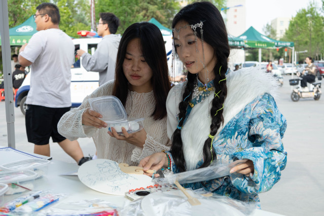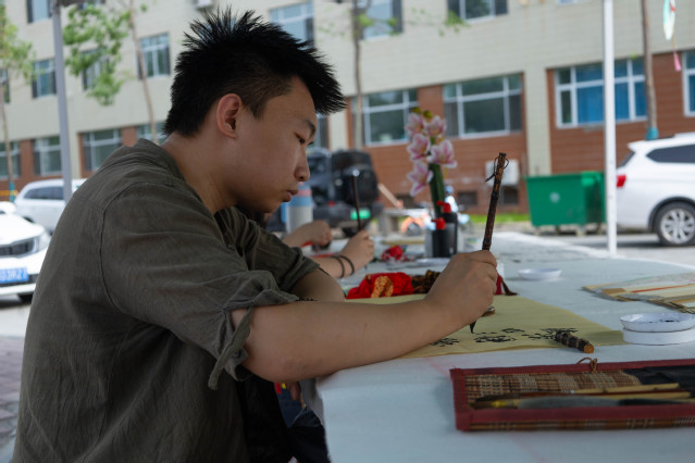 同期舉辦的“中華優秀傳統文化集市”成為互動焦點。漆扇DIY區備齊天然漆料與素白扇骨,書法攤位筆墨氤氳,手工編織區彩繩珠玉流光溢彩。同學們在漆扇與書法攤位揮毫潑墨,將山水書畫融入扇面創作;于手工編織、手帳制作區巧思頻出,打造個性文創;空竹挑戰區更是喝彩不斷,大家在親身體驗中感受非遺技藝的獨特魅力?,F場笑語飛揚,青春活力與文化底蘊交織成動人圖景。