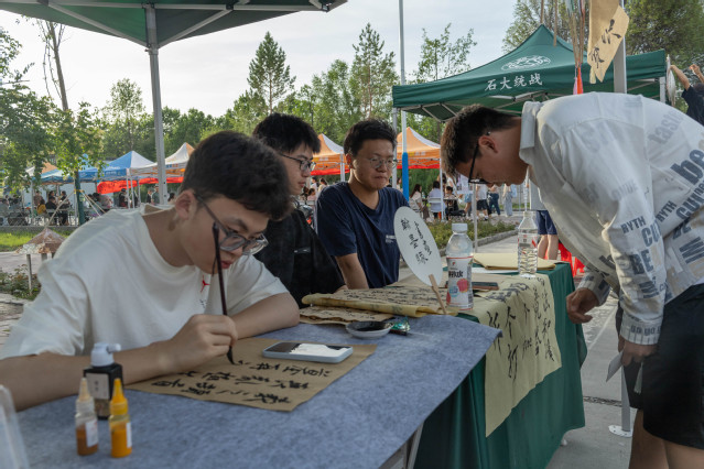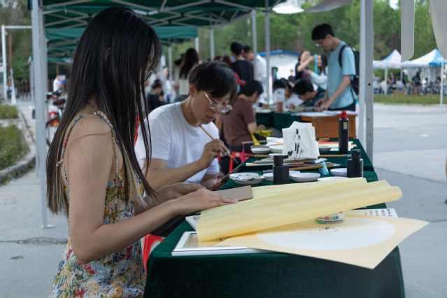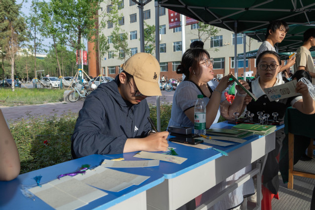 此外,活動還創(chuàng)新性推出“書香墨韻”“非遺匠心”“詩韻傳承”三大主題體驗集群。書名聯(lián)結(jié)與三行詩接力以文字為媒,激發(fā)文學創(chuàng)作靈感;國畫雅集內(nèi),師生們在宣紙之上揮毫潑墨,寫意山水躍然紙上;非遺錦灰堆制作與漆扇繪制區(qū)域,大家沉浸于傳統(tǒng)技藝的繁復工序,感受非遺文化的精妙絕倫。胡楊飛花令與傳統(tǒng)知識有獎問答環(huán)節(jié)將現(xiàn)場氛圍推向高潮,師生們引經(jīng)據(jù)典、妙語連珠,在智慧碰撞間深化對傳統(tǒng)文化的認知,厚植文化自信,讓中華文脈在互動體驗中煥發(fā)新生。