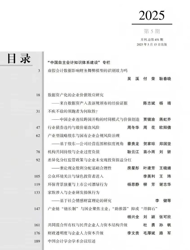 近日,我校經(jīng)濟(jì)與管理學(xué)院楊興全教授以第一作者身份與博士研究生劉潁撰寫的學(xué)術(shù)論文“產(chǎn)業(yè)鏈‘鏈長(zhǎng)制’與國(guó)企聚焦主業(yè):‘助推器’抑或‘絆腳石’”在會(huì)計(jì)學(xué)領(lǐng)域權(quán)威期刊《會(huì)計(jì)研究》2025年第5期正式刊出。《會(huì)計(jì)研究》雜志是財(cái)政部主管、中國(guó)會(huì)計(jì)學(xué)會(huì)主辦的國(guó)家一級(jí)學(xué)術(shù)期刊,是國(guó)家自然科學(xué)基金委員會(huì)認(rèn)定的管理科學(xué)A類重要學(xué)術(shù)期刊。