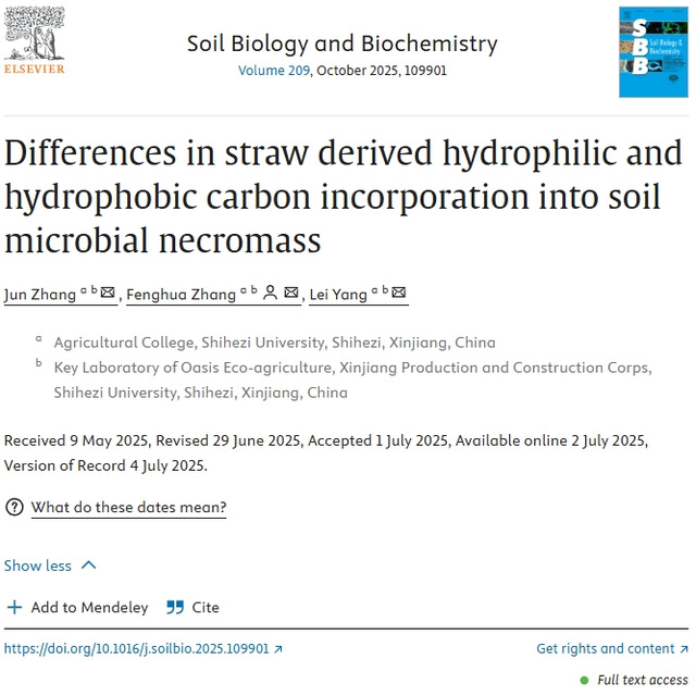近日,我校農學院“綠洲農業生態與環境”創新團隊張鳳華教授在新疆長期棉稈還田背景下土壤有機碳固持方面取得新進展,研究成果以“Differences in straw derived hydrophilic and hydrophobic carbon incorporation into soil microbial necromass”(秸稈衍生的親水碳和疏水碳融入土壤微生物殘體的差異)發表在國際土壤學頂級學術期刊《Soil Biology and Biochemistry》(中科院一區,TOP,IF:10.3)。
