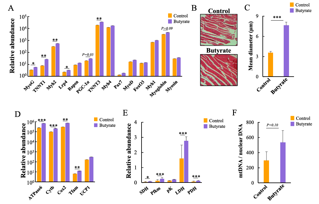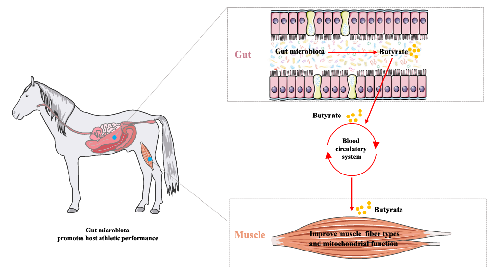 有益微生物在宿主生理機能中起著至關重要的作用,但特定細菌的功能是否有助于賽馬(純血馬)的卓越運動表現,還需要進一步研究來明確。在此,我們發現腸道產丁酸菌與賽馬(純血馬)的運動表現之間存在關聯。產丁酸菌和微生物丁酸合成基因在賽馬腸道中顯著豐富,氣相色譜-質譜分析結果也證實了這一結論。通過使用小鼠模型,我們證明了丁酸足以提高賽馬在跑步機上的運行時間表現。記一步研究發現丁酸能改善宿主對運動的反應,顯著改變骨骼肌中的肌肉纖維類型,并提高肌肉線粒體的功能和活性。此外,對已發表數據的深入分析顯示,丁酸合成基因在人類運動員的腸道微生物中也顯著豐富。這項研究表明,腸道微生物產生的丁酸通過腸道-骨骼肌軸改善了運動能力,為腸道微生物功能提供了新的見解,并為通過有針對性的腸道微生物組操縱來提高運動表現鋪平了道路。