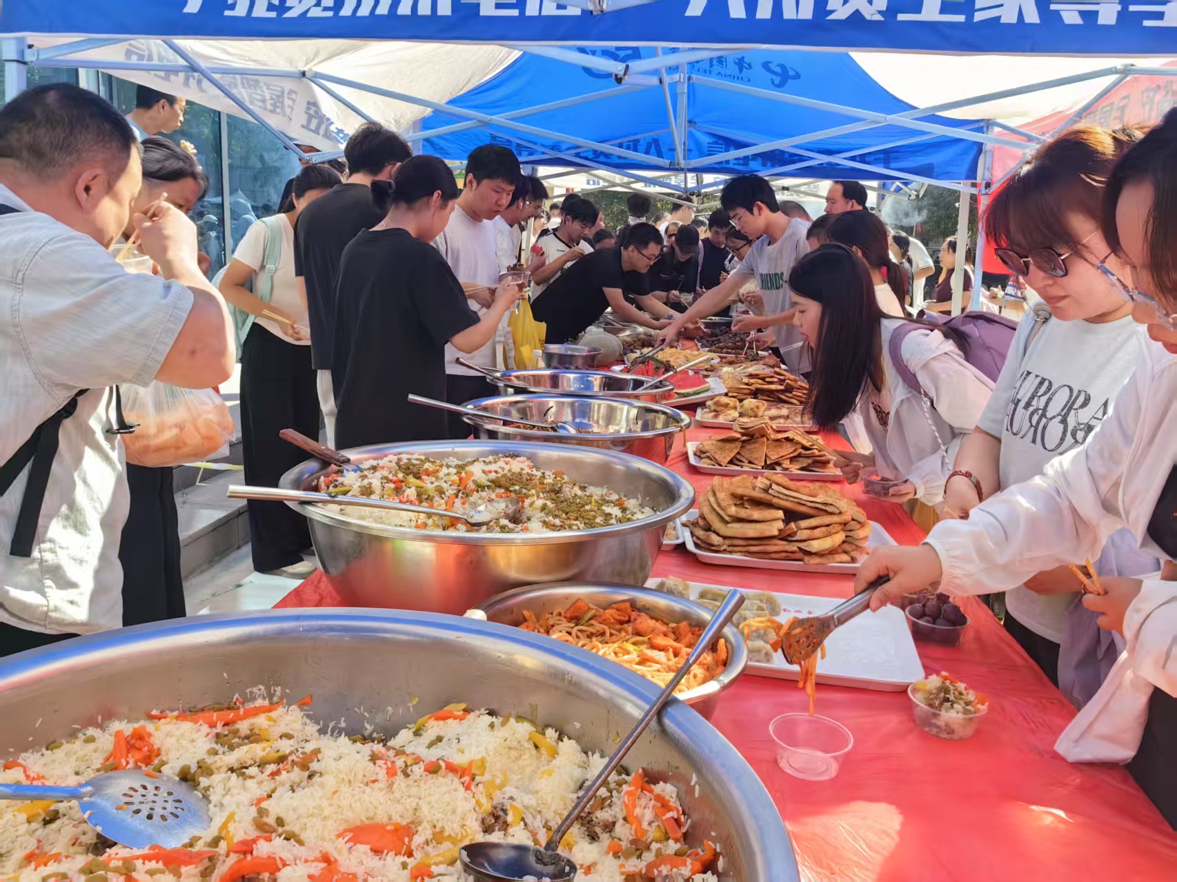 為了讓初抵校園的新生與家長第一時間感受到家的溫暖,后勤服務(wù)中心飲食中心提前謀劃,在全校各校區(qū)精心布設(shè)7個服務(wù)點,將地道新疆美食送到師生及家長身邊。活動期間,每日中午12:30至14:30,東區(qū)、北苑新區(qū)、北區(qū)、中區(qū)、南區(qū)、南山新校區(qū)、護(hù)校七個校區(qū)的食堂門前同步開啟“特色美食迎新生”活動,為全體新生及家長獻(xiàn)上充滿濃郁新疆風(fēng)味的“校園第一餐”。