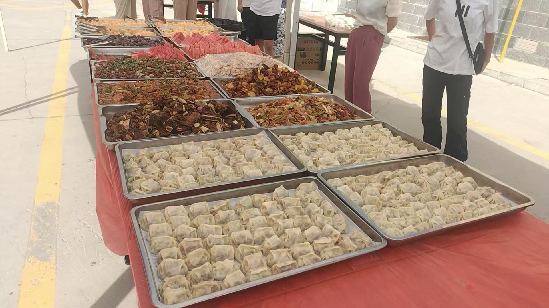 活動菜品以新疆特色風(fēng)味為主,從主食、特色菜到水果均經(jīng)過精心挑選,力求滿足大家的味蕾需求。主食類準(zhǔn)備充足,共送出抓飯3700份、烤包子4150個、羊肉串18800串,此外還有拌面、干煸炒面、丁丁炒面及馕等經(jīng)典新疆美食;特色菜品方面,沙灣大盤雞、黃面烤肉、椒麻雞、石河子涼皮、大盤魚、炒米粉等“硬核”美味輪番供應(yīng),且始終秉持“無限滿足就餐需求”的原則,努力讓每一位新生及家長都品嘗到心儀的新疆美食;水果補給同樣豐富,共送出西瓜2800公斤、哈密瓜1850公斤、葡萄900公斤,為新生和家長及時補充了能量。不僅如此,飲食中心的商超、飲品窗口還免費提供了3500瓶冷飲,幫助大家消暑解渴。