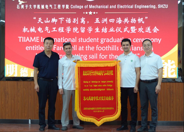 8月25日,石河子大學(xué)機(jī)械電氣工程學(xué)院在北苑新區(qū)工科樓為2025屆烏茲別克斯坦留學(xué)生舉辦結(jié)業(yè)儀式暨歡送會(huì)。學(xué)院黨委書(shū)記湯驊,黨委副書(shū)記、院長(zhǎng)張若宇等領(lǐng)導(dǎo),各辦公室負(fù)責(zé)人、留學(xué)生導(dǎo)師代表高力喬及全體留學(xué)生參加活動(dòng)。